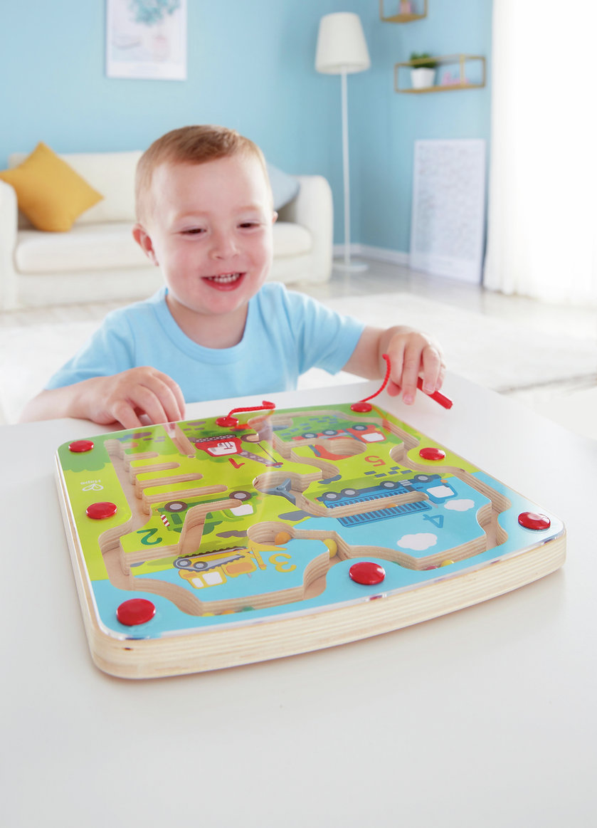 Ce fantastique chantier magnétique et labyrinthe de chiffres est un moyen amusant de se balader dans un chantier de construction, de découvrir les engins de construction et d’apprendre à compter. Vous pouvez l’incliner ou utiliser la baguette pour guider les billes magnétiques à travers les différents chemins, virages et portes à tambour !